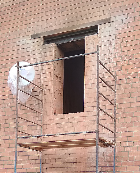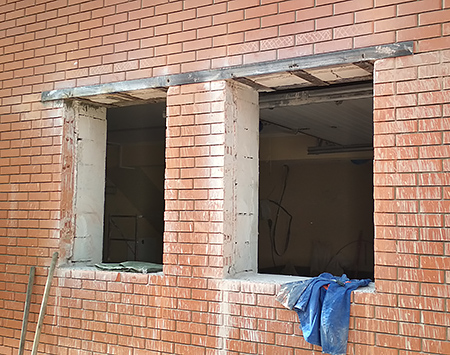 Изготовление окна в кирпичной стене. Фасадная часть в виде арки остается без изменения. Внутренняя кладка кирпичной стены усиливается уголком.