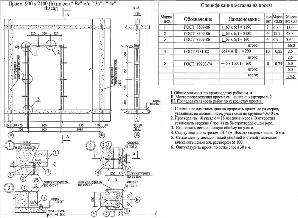 Усиление проема из 75 уголка согласно проекта