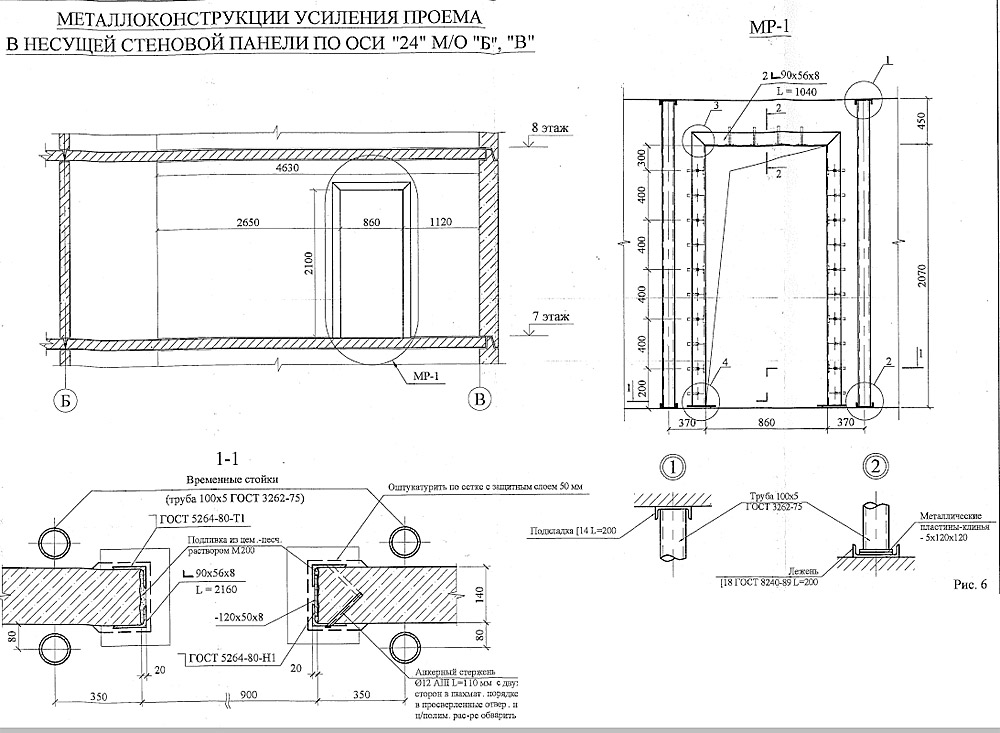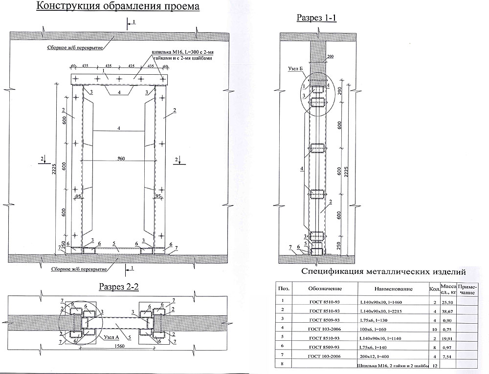 Типовое усиление стандартного проема в 14-18 см стене панельного дома разнополочный уголок 110 х 70 (90х56, 100х63) проект МНИИТЭП.